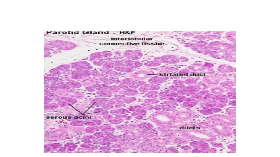 • Surrounded by connective tissue capsule , which sends septa to divide the gland into many lobes and lobules , these septa accompany blood vessels and ducts. • Intralobular, interlobar and main duct are lined by cuboidal, columnar and stratified columnar epithelium respectively. • Each lobule consist of closely packed masses of acini, which are lined by secretory cells • Acini- serous , mucous and mixed.