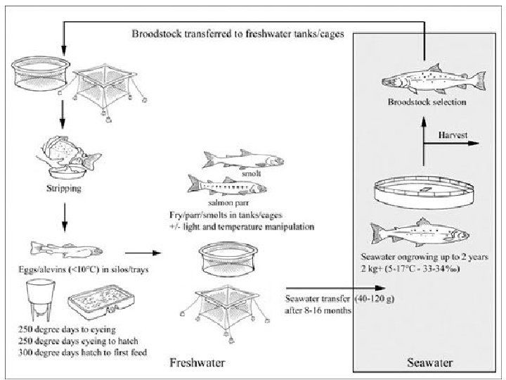 Freshwater Hatchery • Broodstock moved to freshwater tanks or cages in autumn about 2 months before stripping • Eggs stripped dry and fertilised with milt, then water disinfected.