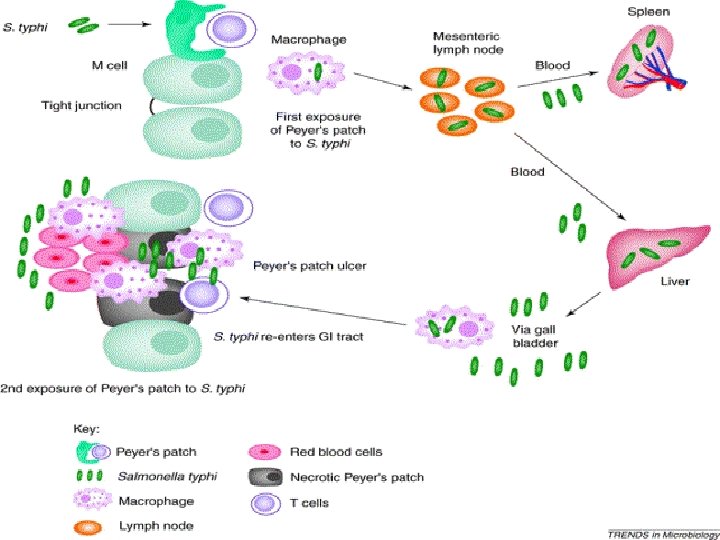 Bile is a good culture medium for the bacillus, it multiplies abundantly in GALL BLADDER involves the INTESTINES PAYERS PATCHES LYMPHOID FOLLICLES