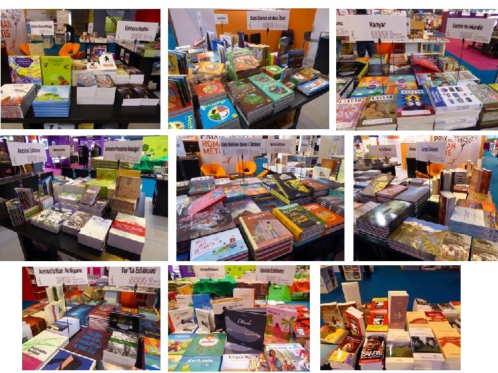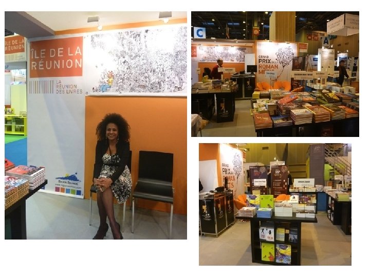 Un stand remarqué • • Une surface de 35 m 2 avec la présence de 13 éditeurs et plus de 150 titres Un emplacement assez intéressant : face au stand du ministère des Outre-mer et du stand des éditeurs corses, le stand a bénéficié de 2 allées assez passantes. L’habillage, la signalétique et les couleurs du stand ont permis une très bonne visibilité, de loin, et aussi d’identifier clairement La Réunion par rapport au stand du ministère des Outre-mer. Il était visible de l’entrée professionnelle grâce à la signalétique suspendue. • La cohérence de l’aménagement du stand a valorisé la richesse de la production éditoriale réunionnaise, une unité et variété qui n’auraient pas été remarquées si chaque éditeur avait eu une table sur le stand de du ministère des Outre-mer. • Présence de 13 éditeurs + romans du Grand Prix Métis et Prix du Roman Métis des Lycées = environ 150 titres présentés. Un planning de dédicaces avec une trentaine d’auteurs présents, réunionnais ou métropolitains. . •