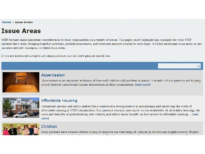 NNIP Partner Activities l Assemble, transform and disseminate data l Apply the data to achieve impact l l Assess and prioritize community needs l Support federally-funded neighborhood initiatives l Develop comprehensive community indicator projects Use data to strengthen civic life and governance l Enhance data capacity of local stakeholders l Building a culture of data access and informed actions