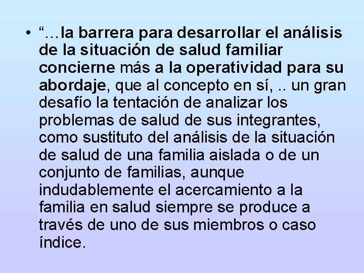 • “…la barrera para desarrollar el análisis de la situación de salud familiar concierne más a la operatividad para su abordaje, que al concepto en sí, . . un gran desafío la tentación de analizar los problemas de salud de sus integrantes, como sustituto del análisis de la situación de salud de una familia aislada o de un conjunto de familias, aunque indudablemente el acercamiento a la familia en salud siempre se produce a través de uno de sus miembros o caso índice.