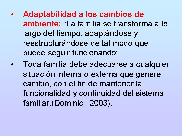 • • Adaptabilidad a los cambios de ambiente: “La familia se transforma a lo largo del tiempo, adaptándose y reestructurándose de tal modo que puede seguir funcionando”. Toda familia debe adecuarse a cualquier situación interna o externa que genere cambio, con el fin de mantener la funcionalidad y continuidad del sistema familiar. (Dominici. 2003).