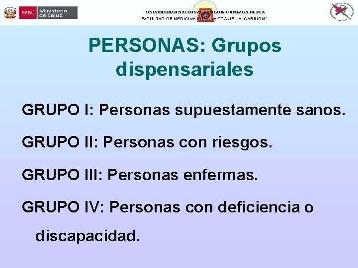 PERSONAS: Grupos dispensariales GRUPO I: Personas supuestamente sanos. GRUPO II: Personas con riesgos. GRUPO III: Personas enfermas. GRUPO IV: Personas con deficiencia o discapacidad.