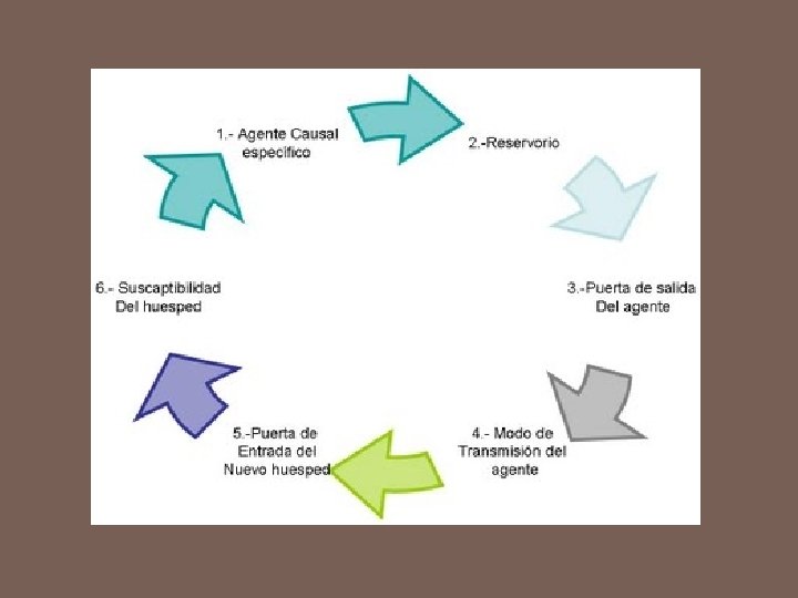 La cadena se compone de: 1) Agente causal o Noxa 2) Reservorio: es el lugar u organismo en donde el agente vive y se multiplica. Puede tratarse del suelo, agua, aire, animales, alimentos, objetos o el propio ser humano. 3) Puerta de salida: es el camino por el cual sale el agente del reservorio. Por ej. : secreciones respiratorias, orina, heces, etc. 4) Vía de transmisión: es el medio que utiliza el agente para llegar hasta el huésped. Puede ser de forma directa (por ej. un beso, contacto sexual, estornudos, por transfusiones sanguíneas, mordeduras, etc) o indirecta (hay un vector que hace de intermediario, por ej mosquitos u otros insectos, animales, agua, alimentos, agujas, etc). 5) Puerta de entrada al huésped: el agente puede ingresar al individuo por vía aérea, digestiva o parenteral (por piel y mucosas) 6) Huésped.
