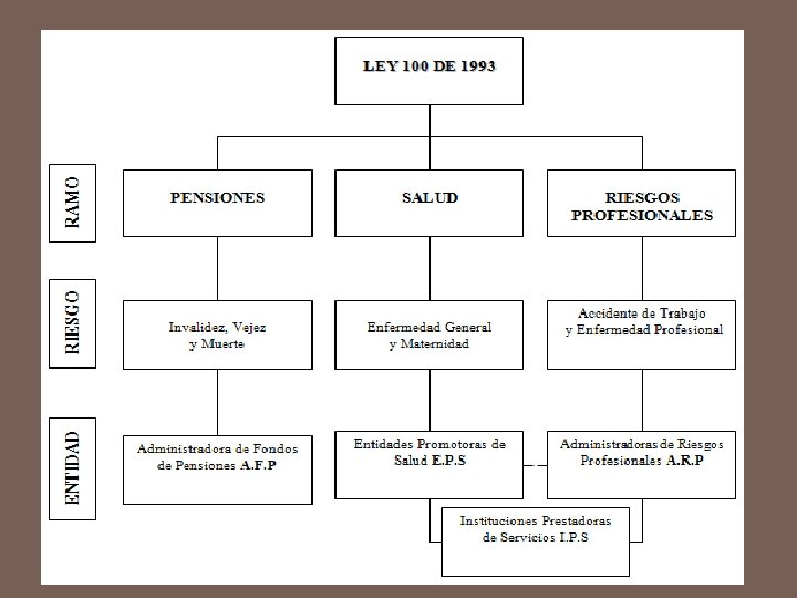 LEY DE SEGURIDAD SOCIAL INTEGRAL (LEY 100 DIC 23 DE 1. 993) SISTEMA GENERAL DE RIESGOS PROFESIONALES SISTEMA GENERAL DE PENSIONES SISTEMA GENERAL DE SALUD 1. 2. ENTIDADES PROMOTORAS EN SALUD INSTITUCIONES PRESTADORAS DE SERVICIOS DE SALUD