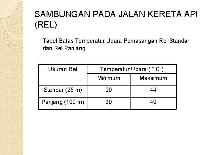 SAMBUNGAN PADA JALAN KERETA API (REL) Tabel Batas Temperatur Udara Pemasangan Rel Standar dan Rel Panjang Ukuran Rel Temperatur Udara ( ° C ) Minimum Maksimum Standar (25 m) 20 44 Panjang (100 m) 30 40