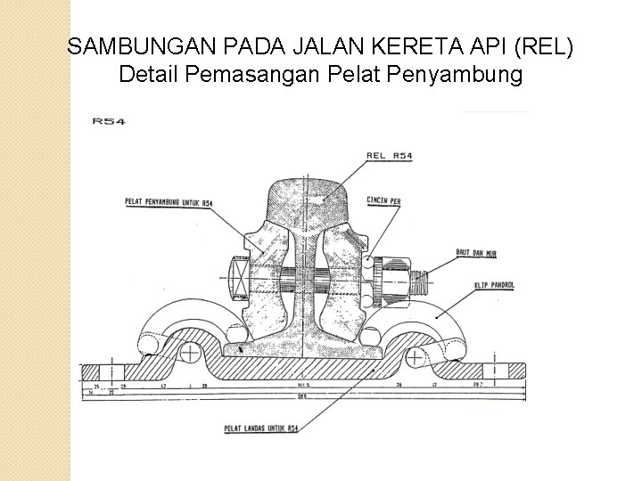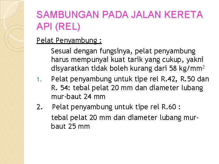 SAMBUNGAN PADA JALAN KERETA API (REL) Pelat Penyambung : Sesuai dengan fungsinya, pelat penyambung harus mempunyai kuat tarik yang cukup, yakni disyaratkan tidak boleh kurang dari 58 kg/mm 2 1. Pelat penyambung untuk tipe rel R. 42, R. 50 dan R. 54: tebal pelat 20 mm dan diameter lubang mur-baut 24 mm 2. Pelat penyambung untuk tipe rel R. 60 : tebal pelat 20 mm dan diameter lubang murbaut 25 mm
