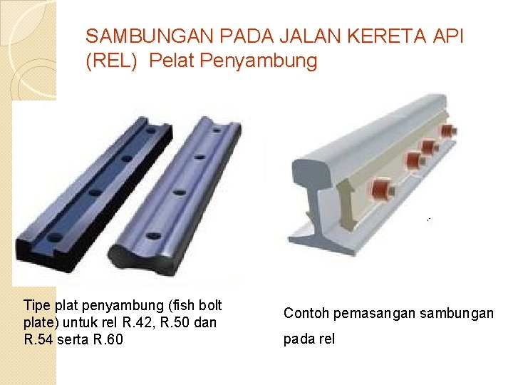 SAMBUNGAN PADA JALAN KERETA API (REL) Pelat Penyambung Tipe plat penyambung (fish bolt plate) untuk rel R. 42, R. 50 dan R. 54 serta R. 60 Contoh pemasangan sambungan pada rel