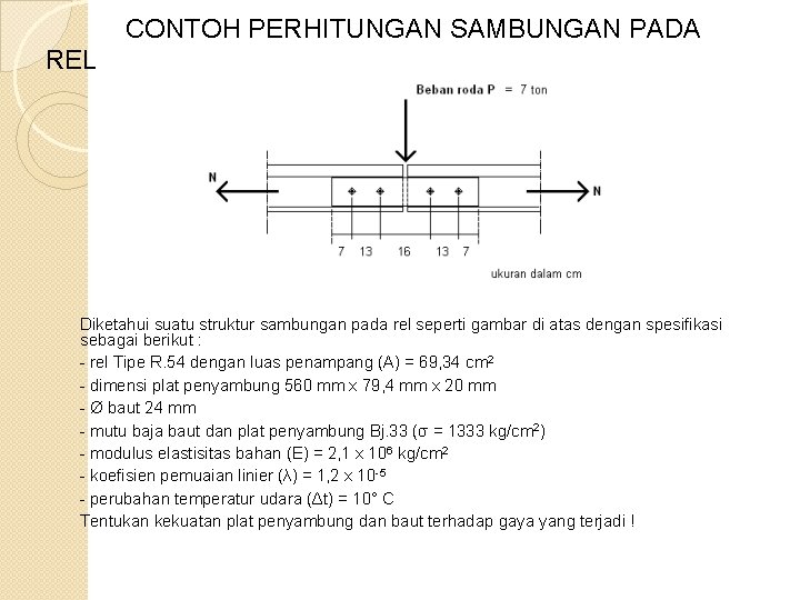 CONTOH PERHITUNGAN SAMBUNGAN PADA REL Diketahui suatu struktur sambungan pada rel seperti gambar di atas dengan spesifikasi sebagai berikut : - rel Tipe R. 54 dengan luas penampang (A) = 69, 34 cm 2 - dimensi plat penyambung 560 mm x 79, 4 mm x 20 mm - Ø baut 24 mm - mutu baja baut dan plat penyambung Bj. 33 (σ = 1333 kg/cm 2) - modulus elastisitas bahan (E) = 2, 1 x 106 kg/cm 2 - koefisien pemuaian linier (λ) = 1, 2 x 10 -5 - perubahan temperatur udara (Δt) = 10° C Tentukan kekuatan plat penyambung dan baut terhadap gaya yang terjadi !