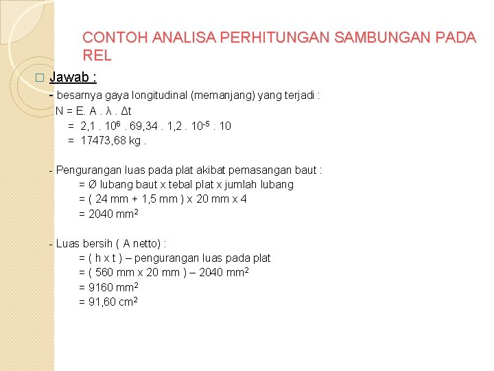 CONTOH ANALISA PERHITUNGAN SAMBUNGAN PADA REL � Jawab : - besarnya gaya longitudinal (memanjang) yang terjadi : N = E. A. λ. Δt = 2, 1. 106. 69, 34. 1, 2. 10 -5. 10 = 17473, 68 kg. - Pengurangan luas pada plat akibat pemasangan baut : = Ø lubang baut x tebal plat x jumlah lubang = ( 24 mm + 1, 5 mm ) x 20 mm x 4 = 2040 mm 2 - Luas bersih ( A netto) : = ( h x t ) – pengurangan luas pada plat = ( 560 mm x 20 mm ) – 2040 mm 2 = 9160 mm 2 = 91, 60 cm 2
