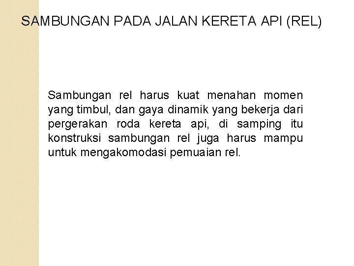 SAMBUNGAN PADA JALAN KERETA API (REL) Sambungan rel harus kuat menahan momen yang timbul, dan gaya dinamik yang bekerja dari pergerakan roda kereta api, di samping itu konstruksi sambungan rel juga harus mampu untuk mengakomodasi pemuaian rel.