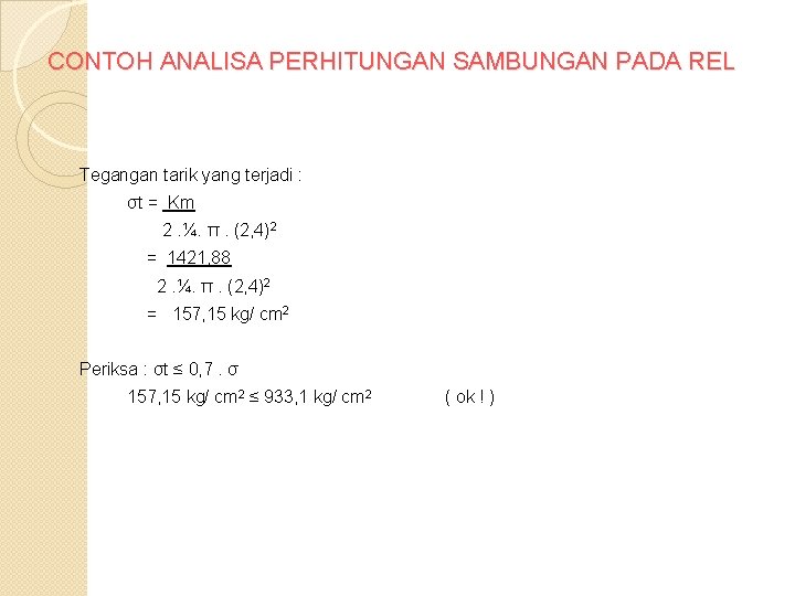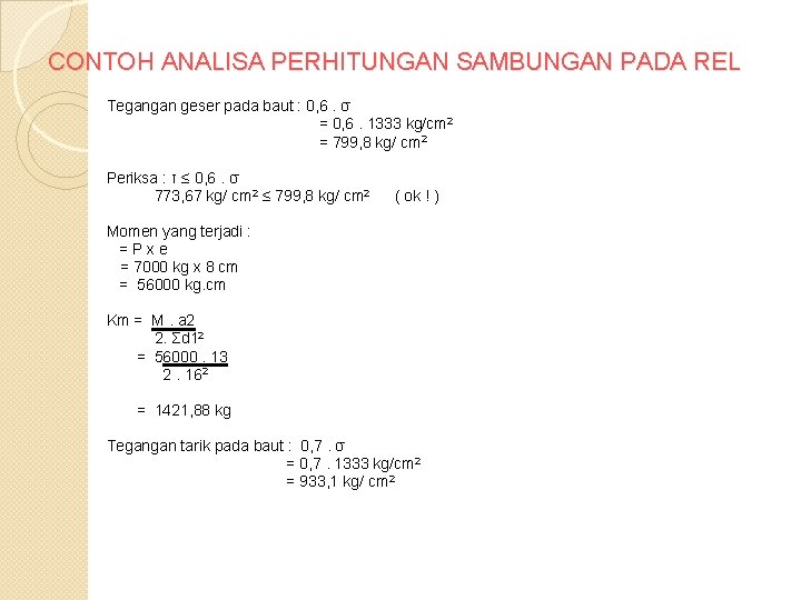CONTOH ANALISA PERHITUNGAN SAMBUNGAN PADA REL Tegangan tarik yang terjadi : σt = Km 2. ¼. π. (2, 4)2 = 1421, 88 2. ¼. π. (2, 4)2 = 157, 15 kg/ cm 2 Periksa : σt ≤ 0, 7. σ 157, 15 kg/ cm 2 ≤ 933, 1 kg/ cm 2 ( ok ! )