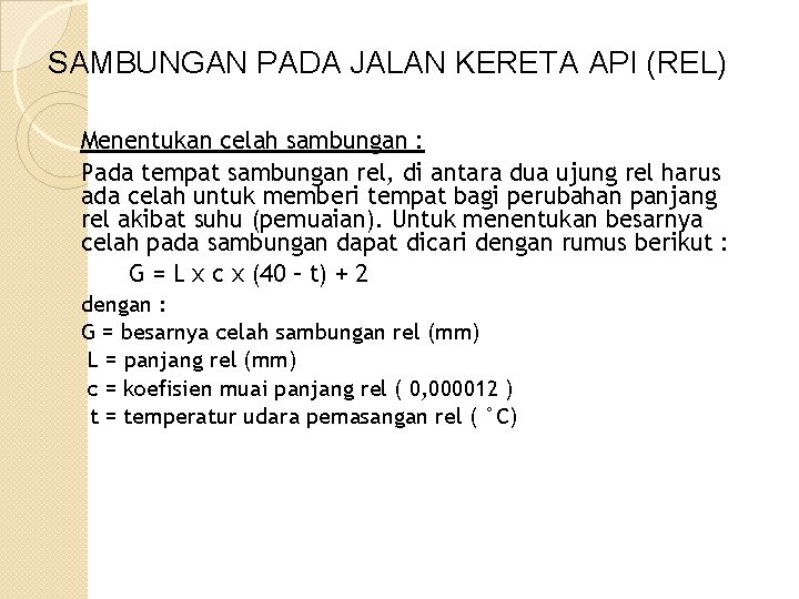 SAMBUNGAN PADA JALAN KERETA API (REL) Menentukan celah sambungan : Pada tempat sambungan rel, di antara dua ujung rel harus ada celah untuk memberi tempat bagi perubahan panjang rel akibat suhu (pemuaian). Untuk menentukan besarnya celah pada sambungan dapat dicari dengan rumus berikut : G = L x c x (40 – t) + 2 dengan : G = besarnya celah sambungan rel (mm) L = panjang rel (mm) c = koefisien muai panjang rel ( 0, 000012 ) t = temperatur udara pemasangan rel ( °C)