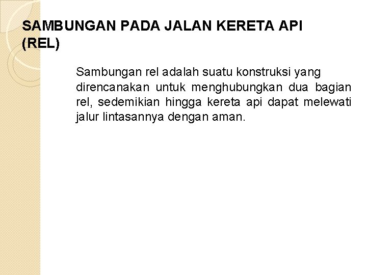 SAMBUNGAN PADA JALAN KERETA API (REL) Sambungan rel adalah suatu konstruksi yang direncanakan untuk menghubungkan dua bagian rel, sedemikian hingga kereta api dapat melewati jalur lintasannya dengan aman.