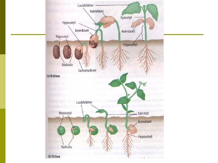 Vorgang der Keimung Nach Hydrierung: Freisetzung von Enzymen => Abbau der Vorratsstoffe des Endosperms/der Kotyledonen p Nährstoffe zu Wachstumszonen des Embryo transportiert p Erstes austretendes Organ: Keimwurzel (Radicula), anschließend muss Spross. Spitze Erdoberfläche durchbrechen p