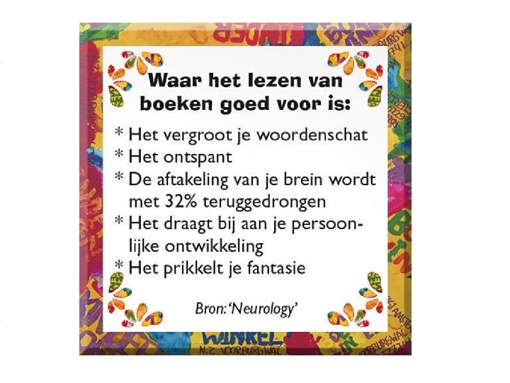 Samen kunnen we het leesplezier vergroten! Meer lezen is beter in taal: • woordenschat • begrijpend lezen • schrijfstijl • spelling • kennis van grammatica