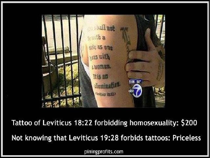 The Bible also says… l l l That a woman must marry her rapist (Deuteronomy 22: 28 -29). That divorce and remarrying are adultery (Luke 16: 18). That getting a tattoo is not cool (Leviticus 19: 28)