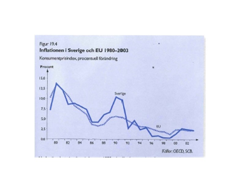 Inflation Hög arbetslöshet ger låg inflation (låga löneökningar) Arbetslöshet