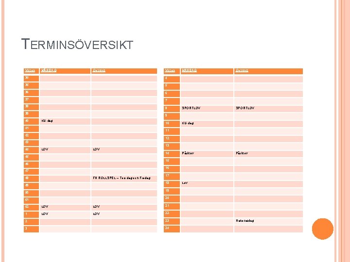 TERMINSÖVERSIKT VECKA MÅNDAG ONSDAG VECKA 34 4 35 5 36 6 37 7 38 8 39 40 ONSDAG SPORTLOV 9 KU-dag 10 41 KU-dag 11 42 12 43 44 MÅNDAG 13 LOV 45 14 Påsklov 15 46 16 47 48 FN: ROLLSPEL – Torsdag och Fredag 17 18 49 Lov 19 50 20 51 52 LOV 21 1 LOV 22 2 23 3 24 Nationaldag
