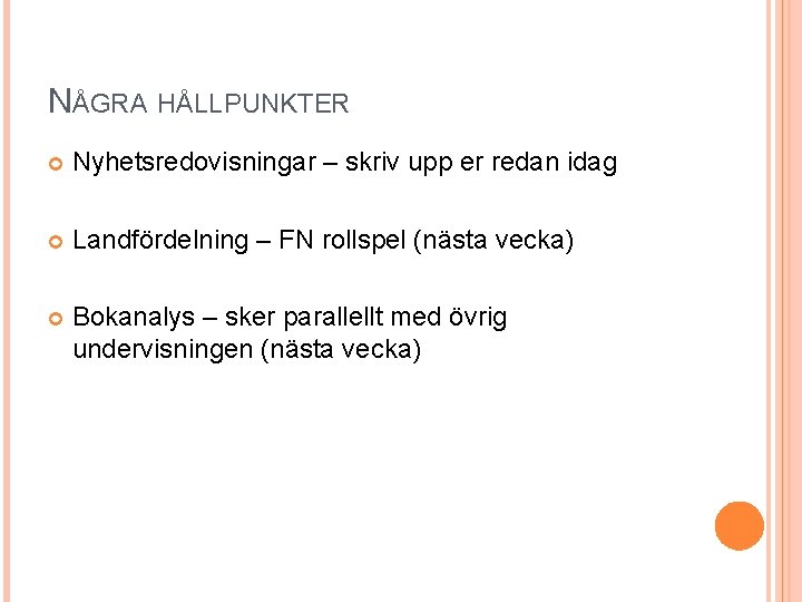 NÅGRA HÅLLPUNKTER Nyhetsredovisningar – skriv upp er redan idag Landfördelning – FN rollspel (nästa vecka) Bokanalys – sker parallellt med övrig undervisningen (nästa vecka)