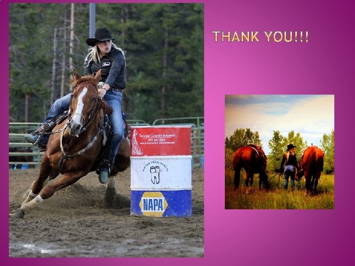 CONTINUED… 2007 NBHA (National Barrel Horse Association) Youth 1 -D State Champion � 2007 High Country Stampede All Around Cowgirl, Barrel Racing Champion & Pole Bending Champion. � 2008 CPRA Finals Qualifier � 2008 WRA Finals Qualifier � 2009 Adams County Coors Rodeo Champion Barrel Racer and Arena Record � 2010 Grover PRCA Champion Barrel Racer � 2010 Mountain States Circuit WPRA (Women's Professional Rodeo Association) Rookie of the Year � 2010 13 th National Rookie of the Year Contender � 2010 5 th Mountain State Circuit WPRA Year End (as a Rookie) � 2010 CPRA Finals Qualifier �