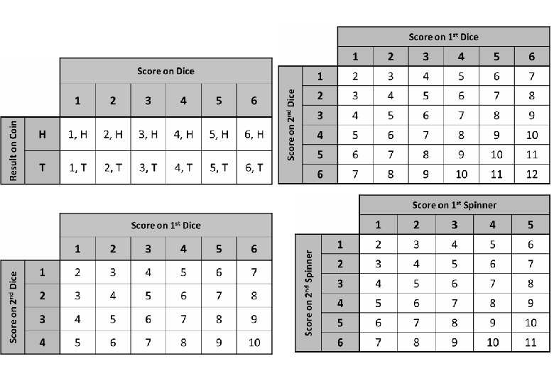 A 6 -sided and a 4 -sided die are thrown and their scores added. What is P(4 or 7)? = P(4) + P(7) Score on 2 nd Dice Score on 1 st Dice 1 2 3 4 5 6 7 8 9 4 5 6 7 8 9 10