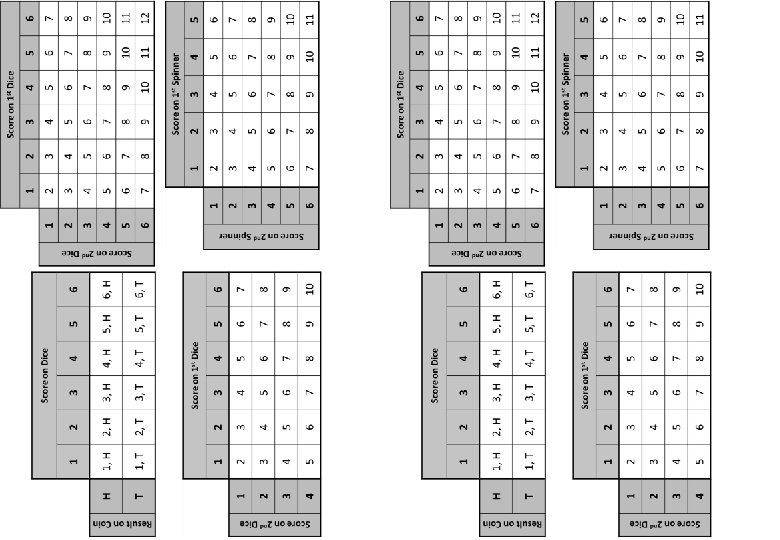 What is P(6 or less)? Two fair spinners are spun and their scores added. Score on 2 nd Spinner Score on 1 st Spinner 1 2 3 4 5 6 7 8 4 5 6 7 8 9 10 11