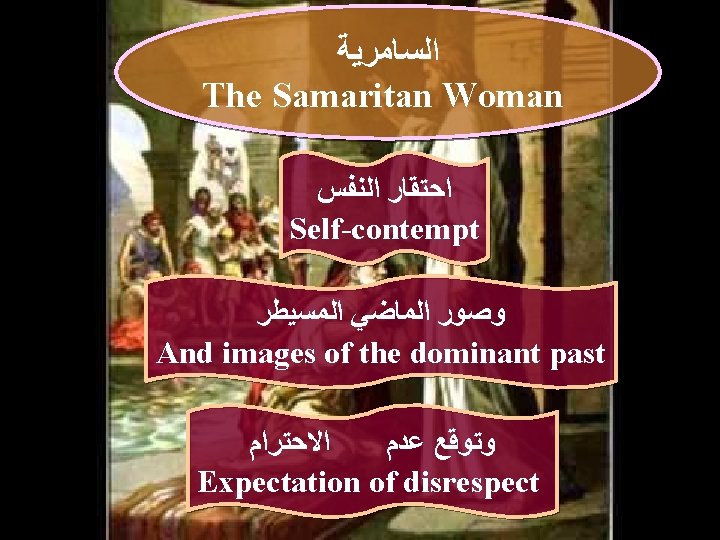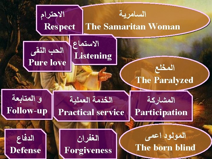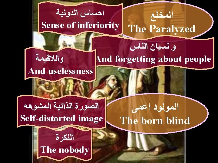 ﺍﻟﻌﻼﻗﺎﺕ ﺫﻝ ﺍﻟﺴﺎﻣﺮﻳﺔ Humiliation The Samaritan Woman of relations ﺍﻟﻌﻘﺎﺏ. . ﻣﻀﺎﻋﻔﺎﺕ ﺍﻟﺨﻄﻴﺔ Complications of sin. . Punishment ﺍﻟﻤﺨﻠﻊ The Paralyzed ﻭﺍﻻﻳﺎﻡ ﻗﺴﻮﺓ ﺍﻟﻨﺎﺱ. . ﺍﻟﺘﺠﺮﺑﺔ Temptation. . The cruelty of people and days ﺍﻟﻤﻮﻟﻮﺩ ﺍﻋﻤﻰ The born blind