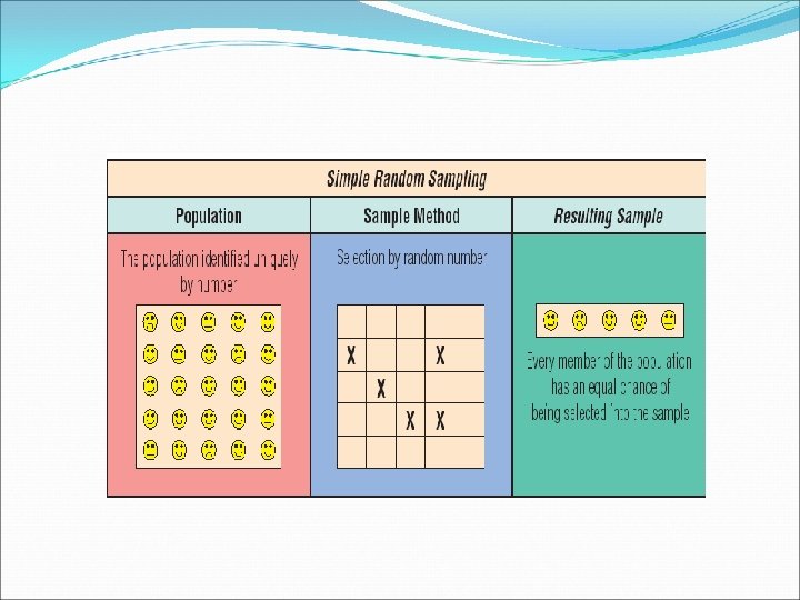 Probability Sampling Methods Simple Random Sampling Simple random sampling The probability of being selected is “known and equal” for all members of the population • Blind Draw Method (e. g. names “placed in a hat” and then drawn randomly) • Random Numbers Method (all items in the sampling frame given numbers, numbers then drawn using table or computer program) Advantages • Known and equal chance of selection • Easy method when there is an electronic database