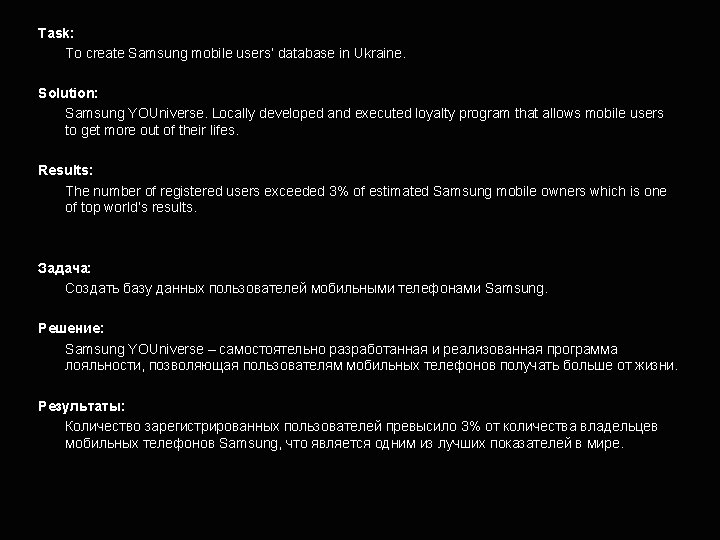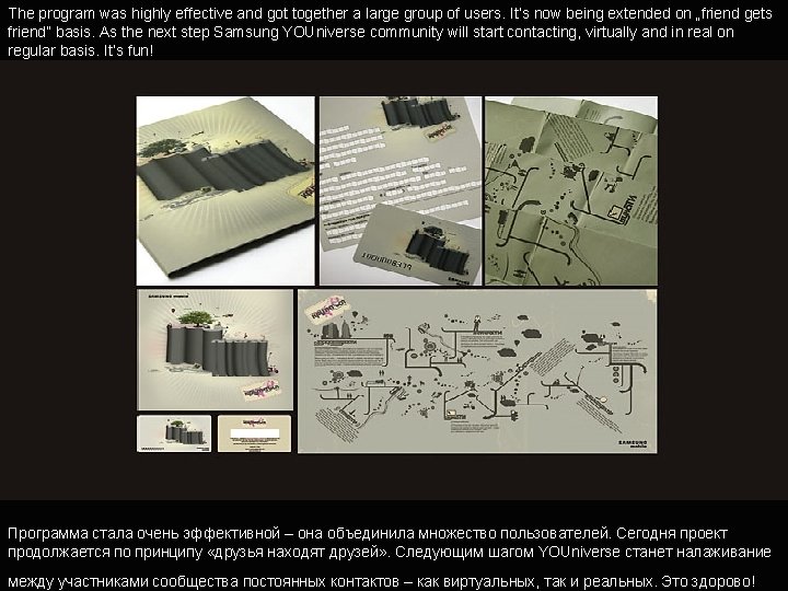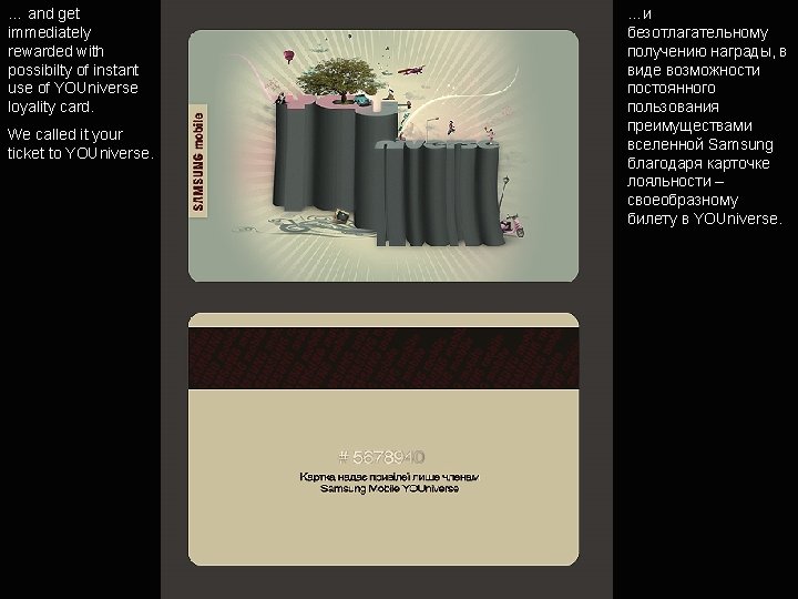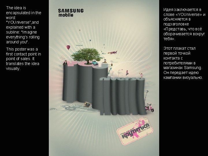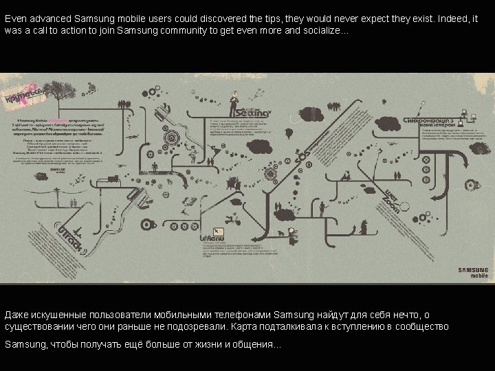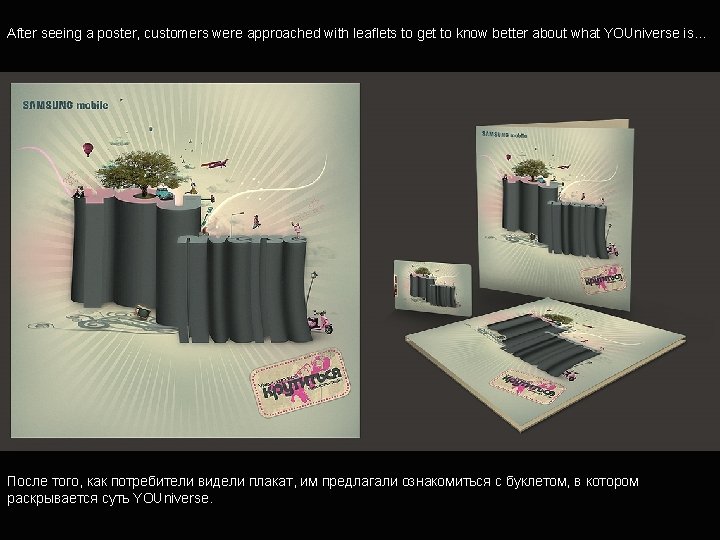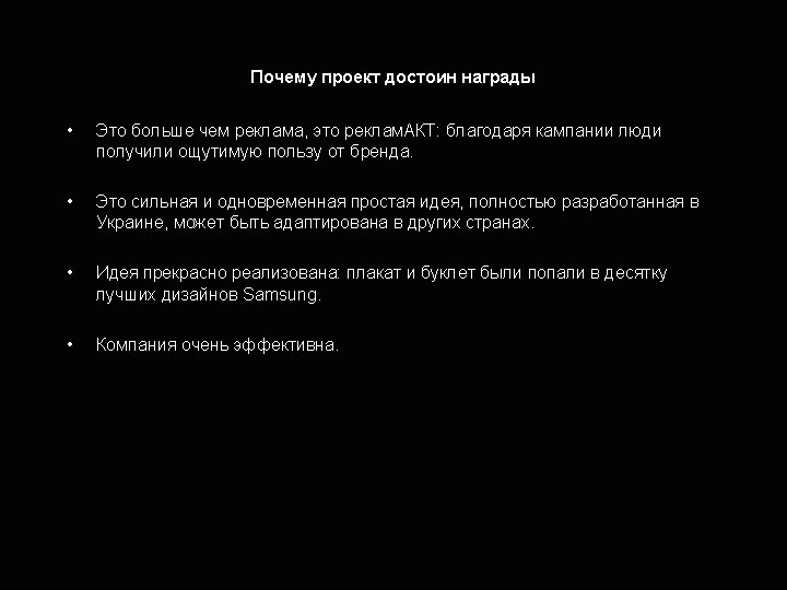 Why is this project worth award • It’s more than ad, it’s an act: thanks to the campaign idea people get a real benfit from the brand. • It’s a powerfull yet simple idea, developed entirely in Ukraine and it has a chance to be adapted in other countries. • It’s beautifully crafted: Poster and leaflet voted among top ten designs by Samsung. • It’s highly effective.