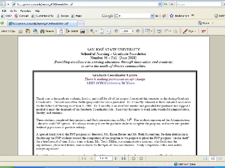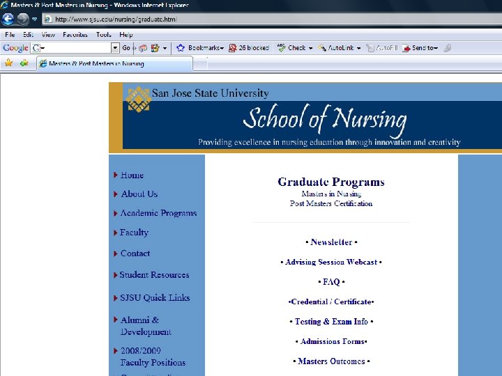 Web Sites n n n n San Jose State University website http: //www. sjsu. edu School of Nursing Graduate Program http: //www. sjsu. edu/nursing/ms. htm University catalog on line http: //info. sjsu. edu Articulation agreements; course equivalency http: //artic. sjsu. edu Graduate forms http: //www 2. sjsu. edu/gradstudies/Current/Forms. html Dr. Connolly Faculty Web Page http: //www. sjsu. edu/faculty_and_staff/faculty_detail. jsp? id= 213 Special Sessions Registration Form http: //galaxy. sjsu. edu/special. Session/pdfs/rdform. pdf