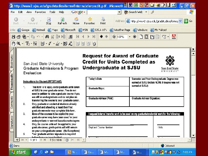 Thinking About Master’s Program? You may take, on space available, and with the approval of the Graduate Coordinator, a graduate course during Semester 8 of your undergraduate Program YES, there is a form!! http: //www. sjsu. edu/gradstudies/forms/in ternalxfercredit. pdf Be careful that you do not enroll in a course that is in a time conflict with your undergraduate courses n