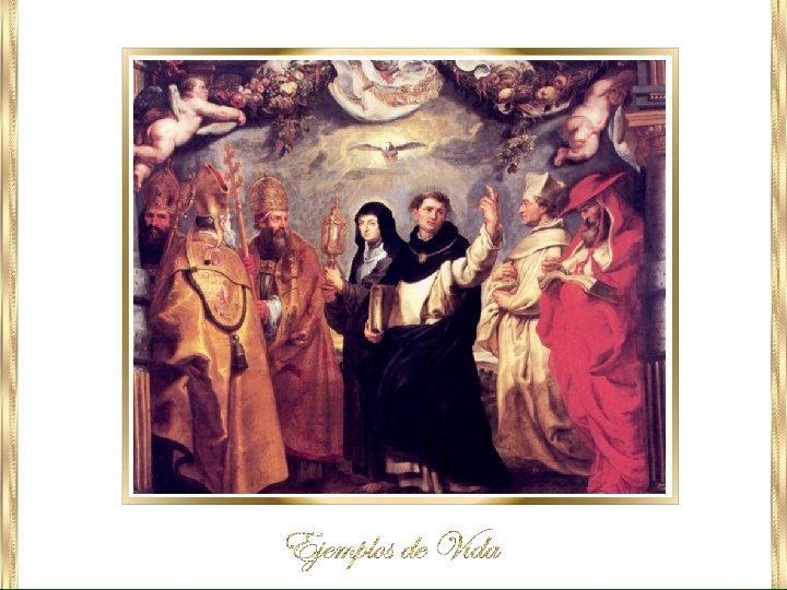 Santo Domingo de Guzmán Confesor 1170 Caleruega, Burgos † 1221 Bolonia 4 de agosto Santo Domingo, fundador de la Orden de los Hermanos Predicadores, es representado con un lirio en la mano, símbolo de la virginidad que conservó durante toda su vida. El can que su madre vio en sueños llevando una antorcha encendida, representa la guerra que hizo a los herejes y la luz que difundió en el corazón de los pecadores por la pureza de su doctrina y la santidad de su vida. Acaeció su muerte en 1221.