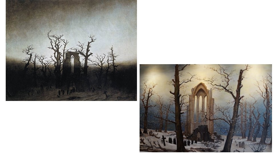 Eléments d’analyse de la peinture: Voir analyse de cette peinture sur le site Mucri (musée critique de la Sorbonne): article de Mathilde Labbé « Le crépuscule était son élément » Faire confiance à son regard … et à nos capacités d’analyses formes/significations Le peintre: Caspar David Friedrisch (1774 -1840) biographèmes romantiques (notamment la perte de quasi tous ses proches lorsqu’il est enfant; la maladie mentale; le succès et l’abandon); toile devenue l’archétype institutionnalisée et scolaire du romantisme: Le voyageur contemplant une mer de nuages Les motifs picturaux romantiques: l’abbaye en ruine = sacré + perte (noter que la thématisation des ruines naît déjà au siècle des Lumières mais les romantiques lui confèrent cette dimension sacrée, mystique). La forêt ou quelques arbres = significations symboliques attachées aux arbres; effets plastiques de verticalité ; effets conjugués à l’horizontalité de la ligne séparant le ciel de la terre: perception de croix, emblème chrétien par excellence. Le registre romantique: ambiance crépusculaire créée par le clair-obscur; inversion ciel/terre; le guidage spirituel du spectateur. Esthétique romantique: le sublime du paysage; l’herméneutique intérieure; la spiritualisation du matériel; les effets de contraste, d’antithèse; la petitesse de l’humain face à la nature; la palette sombre ou lumineuse; le cadrage ouvert.