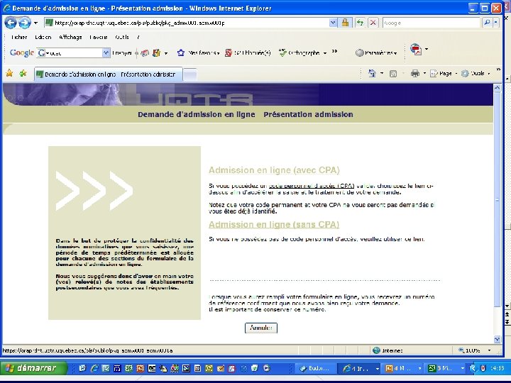 Demande d’admission • Afin de compléter une demande d’admission, vous devez: 1 - Compléter le Formulaire d’admission sur le web: WWW. UQTR. CA ACCÈS DIRECT Admission ADMISSION EN LIGNE (compléter le formulaire en ligne)