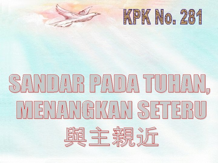 Sandar pada Tuhan menangkan setru kidung menang jadi Slides: 13 Download presentation Sandar pada Tuhan menangkan set’ru, kidung menang jadi kuasa hidupmu. 你當依賴救主, 戰勝諸仇敵, 凱旋歌詩為你 生活的力量, datang percobaan Ia ’kan menuntun, slalu dekat Yesus, Hati senanglah 每日所遇試探, 主必開出路, 常與耶穌親近, 喜樂滿你心. Reff : S’lalu dekat yesus, s’panjang hidupmu, awan g’lap tak pisahkanmu darinya, 常與耶穌親近, 前途雖黑暗, 勿讓愁雲暗影 使你離主遠, Susah atau senang, atau apapun dekat pada Yesus, hati senanglah 無論遇福或禍, 朋友或仇敵, 常與耶穌親近, 喜樂滿你心. jangan tawar hati, dan putus harap, ia akan menanggung s’gala bebanmu. 不可灰心失望, 也不可喪志, 主必照祂應許, 擔當你重擔, Damai sukacita, Dalam hatimu, slalu dekat yesus, hati senanglah 安慰喜樂平安, 主滿足你心, 常與耶穌親近, 喜樂滿你心. Reff : S’lalu dekat yesus, s’panjang hidupmu, awan g’lap tak pisahkanmu darinya, 常與耶穌親近, 前途雖黑暗, 勿讓愁雲暗影 使你離主遠, Susah atau senang, atau apapun dekat pada Yesus, hati senanglah 無論遇福或禍, 朋友或仇敵, 常與耶穌親近, 喜樂滿你心. Bila engkau ragu, Ia ’kan menuntun, Kasihnya besarlah, pasti dan sungguh. 你前程雖渺茫, 但主必指引, 你時刻可獲得, 救主的慈愛, Kuasa rohul kudus menangkan se’tru, S’lalu dekat yesus, Hati senanglah. 願聖靈賜能力, 勝過諸仇敵, 常與耶穌親近, 喜樂滿你心. Reff : S’lalu dekat yesus, s’panjang hidupmu, awan g’lap tak pisahkanmu darinya, 常與耶穌親近, 前途雖黑暗, 勿讓愁雲暗影 使你離主遠, Susah atau senang, atau apapun dekat pada Yesus, hati senanglah 無論遇福或禍, 朋友或仇敵, 常與耶穌親近, 喜樂滿你心.