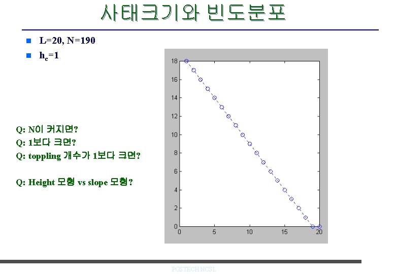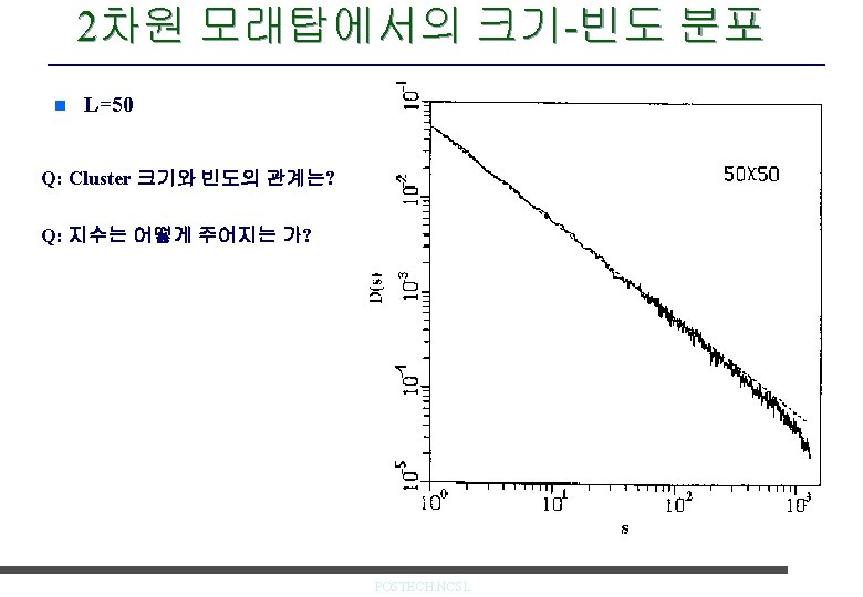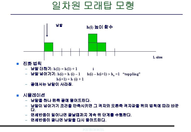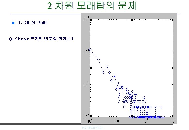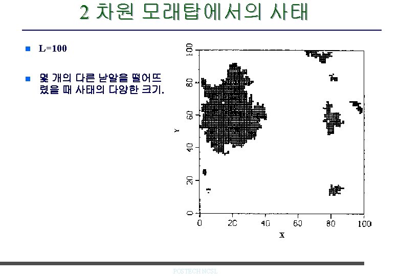 2차원 모래탑 모형 n Critical-height 모형 – 낟알 더하기: m(i, j) = m (i, j) + 1 – 낟알 넘어가기: m(i, j) = m(i, j) – 4 if m(I, j) > mc m(i+1, j) = m(i+1, j) +1 m(i-1, j) = m(i-1, j) +1 m(i, j+1) = m(i, j+1) +1 m(i, j-1) = m(i, j-1) +1 e. g. mc =3 L. P. Kadanoff et al, Phys. Rev. A 39, 6524, 1989. POSTECH NCSL