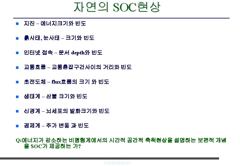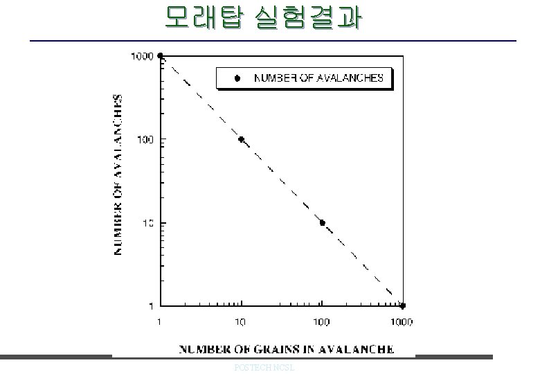 모래탑 n 모래탑 Sandpile – 사태 (Avalanche)가 일어남. n 희귀하지만 큰 규모의 사건. – 스스로짜인 임계현상 self-organized criticality (SOC) P. Bak, How Nature Works: The Science of Self Organized Criticality , Springer-Verlag, 1996 P. Bak, C. Tang and K. Wiesenfeld, PRL 59, 381(1987) POSTECH NCSL