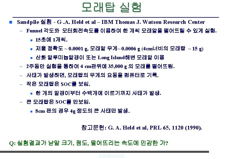 모래탑 실험 n Sandpile 실험 - G. A. Held et al – IBM Thomas J. Watson Research Center 참고문헌: G. A. Held et al, PRL 65, 1120 (1990). POSTECH NCSL