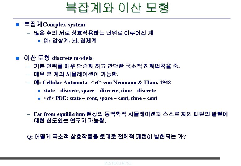Bak, Tang, Wiesenfeld Model n Cellular Automata Model – Height Z(x, y) n Dynamcs: n n Addition : z(x, y) -> z(x, y) + 1 Toppling : if z(x, y) > zc =3, neighbors get one grain each Sand is lost at the boundaries SOC & Power-law – System reaches a self-organized critical state – P(s) ~ S-1. 2 – P. Bak, C. Tang and K. Wiesenfeld, PRL 59, 381 (1987) Java Applet : http: //cmth. phy. bnl. gov/~maslov/Sandpile. htm POSTECH NCSL