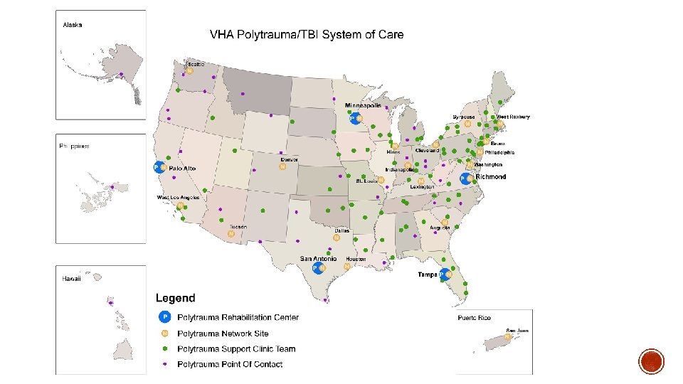 § An integrated nationwide network of facilities § There are: § Five Polytrauma Rehabilitation Centers (PRC) /Polytrauma Residential Transitional Rehabilitation Programs (PTRP) that provide acute, intensive inpatient rehabilitation. These sites also house the Emerging Consciousness (EC) Programs and Assistive Technology (AT) Labs. § Twenty-three Polytrauma Network Sites (PNS) established regionally, which offer continued medical and rehabilitation services closer to home after discharge from a PRC. Also can be the entry point for rehabilitation services for mild-moderate TBI or polytraumatic injury. Provides both inpatient and outpatient services. § Eighty-seven Polytrauma Support Clinic Teams (PNSC) providing specialized outpatient care in coordination with the regional PNS. Can be the entry point for veterans who have experienced a mild-moderate TBI or polytraumatic injury. § And 39 Polytrauma Points of Contact (PPOC) who have no specialized rehabilitation teams, but offer case management and referrals throughout the system. PPOCs may provide a limited range of rehabilitation services.