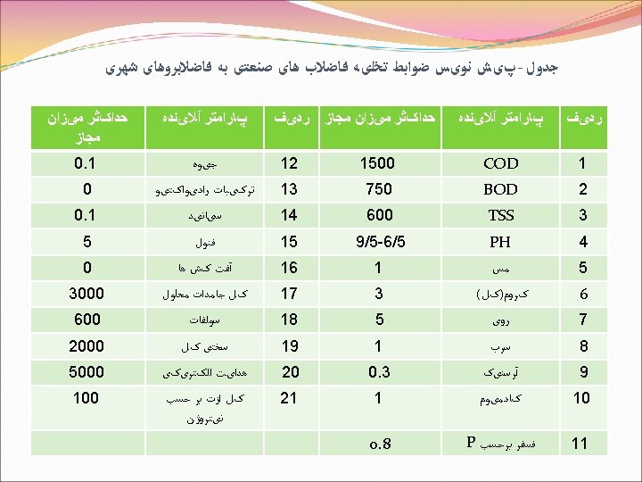 es Recommended microbiological Quality Guidelines for wastewater use in Agriculture Category Reuse conditions Exposed group Intestinal nematodes Fecal coliforms (geometric mean no. Per 100 ml) (arithmetic mean no of egg per liter ) A Irrigation of crops likely to be eaten uncooked, sports fields public parks Workers, consumer, public ≤ 1 B Irrigation of cercal crops, Industrial crops, pasture and Workers ≤ 1000 No standard recommended