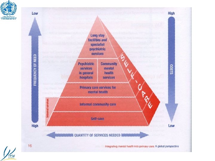 Recommandations de l’OMS pour les soins en Europe (Conférence d’Helsinki 2005) 1 – Mettre en place des services de proximité pour traiter et soigner les personnes ayant des problèmes de santé mentale dans la collectivité. 2 – Des équipes spécialisées doivent être mises en place pour traiter les groupes sensibles dans leurs milieux. Ces services devraient être accessibles 24 heures par jour, 7 jours par semaine, et ils devraient être dispensés par une équipe multidisciplinaire mobile. 3 - Offrir des services résidentiels 4 - Fournir des services de prise en charge des urgences. (…) assurés par des équipes d’urgence mobiles ou rattachées aux hôpitaux. 5 - Assurer la promotion, la prévention et l’information. 6 - Des relations doivent être établies avec les services de santé primaire et avec les services assurés dans le cadre des hôpitaux généraux. 7 - Mener des activités de recherche et de formation en santé mentale communautaire 8 - Liaisons intersectorielles. Santé, protection sociale, emploi, logement, justice, éducation, loisirs. . .
