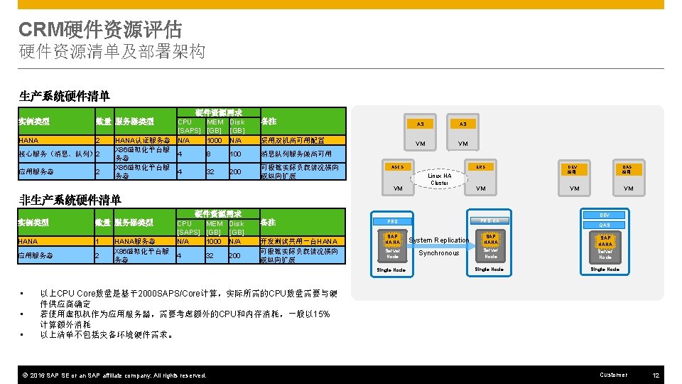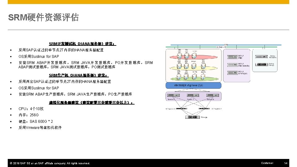 SRM硬件资源评估 虚拟化的子系统包括: SRM开发机ABAP应用(6 C-16 G-200 G) SRM开发机JAVA应用(6 C-32 G-200 G) SRM测试机ABAP应用(6 C-16 G-200 G) SRM测试机JAVA应用(6 C-32 G-200 G) SRM生产机ABAP应用(16 C-64 G-200 G) SRM生产机JAVA应用 1(12 C-64 G-200 G) SRM生产机JAVA应用 2(12 C-64 G-200 G) PO开发系统(6 C-32 G-200 G) PO测试系统(6 C-32 G-200 G) PO生产系统(16 C-64 G-200 G) Webdispatcher服务器 以上系统OS均采用Suslinux for SAP © 2016 SAP SE or an SAP affiliate company. All rights reserved. Customer 15