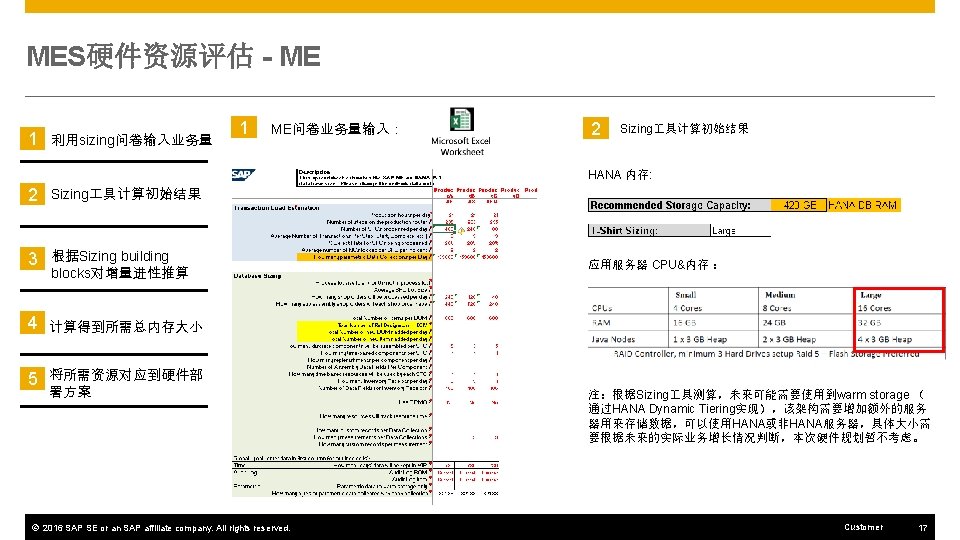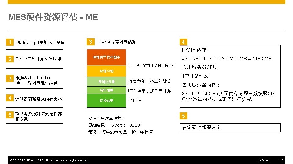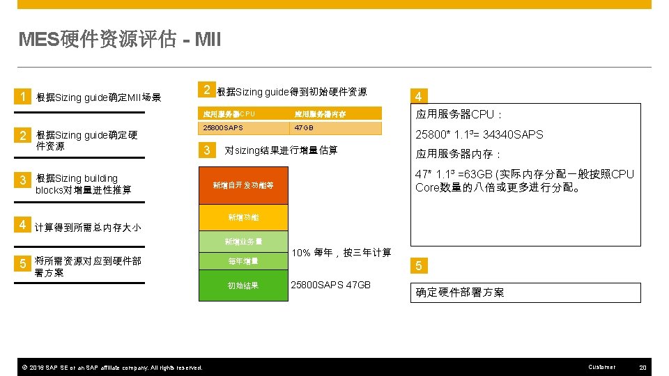 MES硬件资源评估 - MII 1 根据Sizing guide确定MII场景 2 根据Sizing guide确定硬 件资源 3 根据Sizing building blocks对增量进性推算 4 计算得到所需总内存大小 5 将所需资源对应到硬件部 署方案 1 MII场景及业务量确定: 1. Download Production Order Header List from SAP ERP 4. PCo Notification Scenario 2. XML Transformation 5. IDOC Integration Scenario 一般最基本的MII硬件配置可以满足非重叠的IDOC集成场景。 6. Report Production Scenario 3. Retrieving History Data using PCo Query © 2016 SAP SE or an SAP affiliate company. All rights reserved. 7. Report Downtime Customer 19
