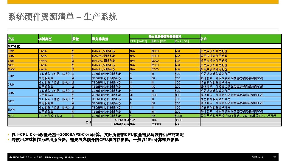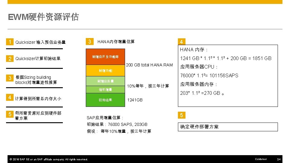 EWM硬件资源评估 1 Quicksizer 输入预估业务量 2 Quicksizer计算初始结果 1 Quick. Sizer 在线 具地址: https: //apps. support. sap. com/sap(b. D 1 lbi. Zj. PTA w. MQ==)/bc/bsp/sap/qs_oberflaeche/hana. do? bsp-language=en 2 Quick. Sizer 计算结果 Quick. Sizer 项目信息: 3 根据Sizing building blocks对增量进性推算 4 计算得到所需总内存大小 5 将所需资源对应到硬件部 署方案 初始结果: 进入该项目后可以看到CRM Sizing的数据 © 2016 SAP SE or an SAP affiliate company. All rights reserved. 应用服务器: CPU: 76000 SAPS 内存: 203 GB HANA数据库:内存: 1241 GB Customer 23