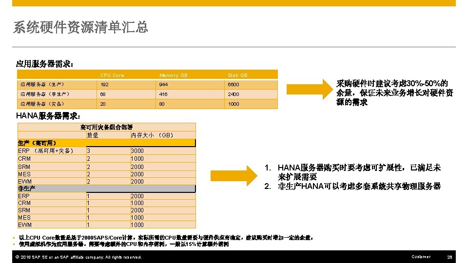 硬件部署架构 ~10 KM 玉林移动通讯公司IDC 非生产环境 ERP DEV 应用 玉柴动力大厦 生产环境 ERP QAS 应用 ERP DI 10 Gbps SAN 生产环境 ERP 核心服务 CRM核心服务 CRM 核心服务 System Replication ERP DI Virtualization CRM DEV 应用 CRM QAS 应用 SRM DEV 应用 SRM QAS 应用 MES DEV 应用 MES QAS 应用 EWM DEV 应用 EWM QAS 应用 CRM DI SRM DI MES DI CRM DI SRM 核心服务 MES 核心服务 EWM 核心服务 Web. Dispatcher EWM DI ERP HANA DEV/QAS MES HANA DEV/QAS VM Hypervisor B CRM HANA DEV/QAS SRM HANA DEV/QAS EWM HANA DEV/QAS 非生产环境HANA MES DI EWM DI NFS Server VM Hypervisor A SRM DI NFS Server VM Hypervisor C ERP PRD HANA (P) ERP PRD HANA (s) CRM PRD HANA (P) CRM PRD HANA (s) SRM PRD HANA (P) SRM PRD HANA (s) MES PRD HANA (P) MES PRD HANA (s) EWM PRD HANA (P) EWM PRD HANA (s) Enterprise Storage A Enterprise Storage B 生产环境HANA © 2016 SAP SE or an SAP affiliate company. All rights reserved. Customer 47