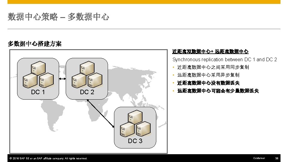 SAP HANA HA & DR 方案选项 选项 2: 利用System Replication实现高可用/灾备组合 System Replication for combined HA/DR HA or DR? RTO Same technical solution for HA and DR over limited distances. Synchronous mode required for HA. Technical corruption protection (block corruption on storage level). Hardware of standby database could theoretically be reused for non-production systems (pre-load off), but: For fast failover (HA), the data must be preloaded on the secondary node(s). DC 1 DC 2 SAP HANA Sync System Replication PRD log data HA and local DR Data loss (RPO) Very fast None DCs / Network HANA nodes Metro distances Low NW latency (~ up to 1 ms) 2 * N SAP HANA PRD HA/DR log data Low latency © 2016 SAP SE or an SAP affiliate company. All rights reserved. Customer 40