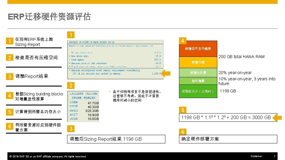 CRM硬件资源评估 1 Quicksizer 输入预估业务量 2 Quicksizer计算初始结果 1 Quick. Sizer 在线 具地址: https: //apps. support. sap. com/sap(b. D 1 lbi. Zj. PTA w. MQ==)/bc/bsp/sap/qs_oberflaeche/hana. do? bsp-language=en 2 Quick. Sizer 计算结果 Quick. Sizer 项目信息: 3 根据Sizing building blocks对增量进性推算 4 计算得到所需总内存大小 5 将所需资源对应到硬件部 署方案 初始结果: 应用服务器: CPU: 13000 SAPS 内存: 31 GB 进入该项目后可以看到CRM Sizing的数据 © 2016 SAP SE or an SAP affiliate company. All rights reserved. HANA数据库:内存: 270 GB Customer 10